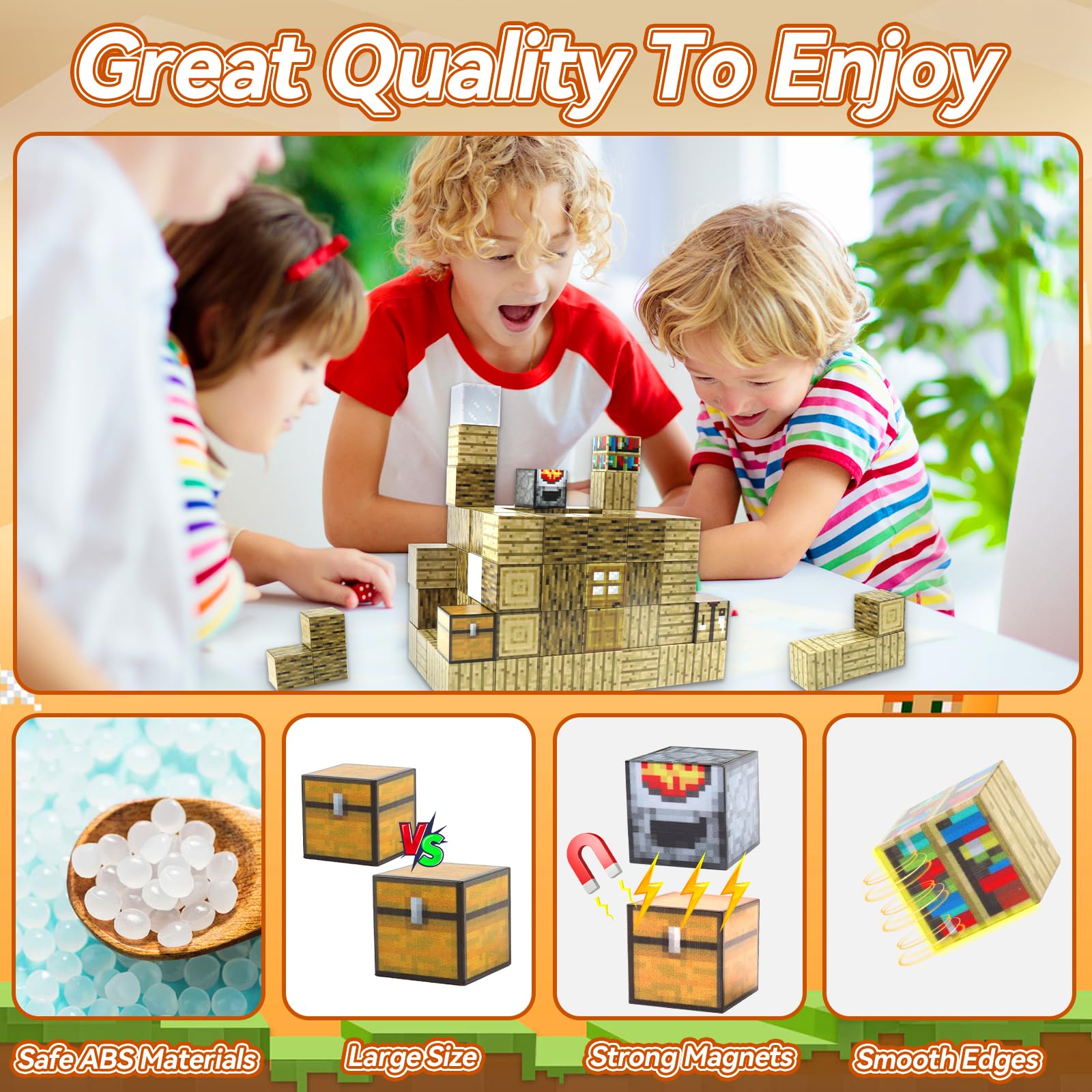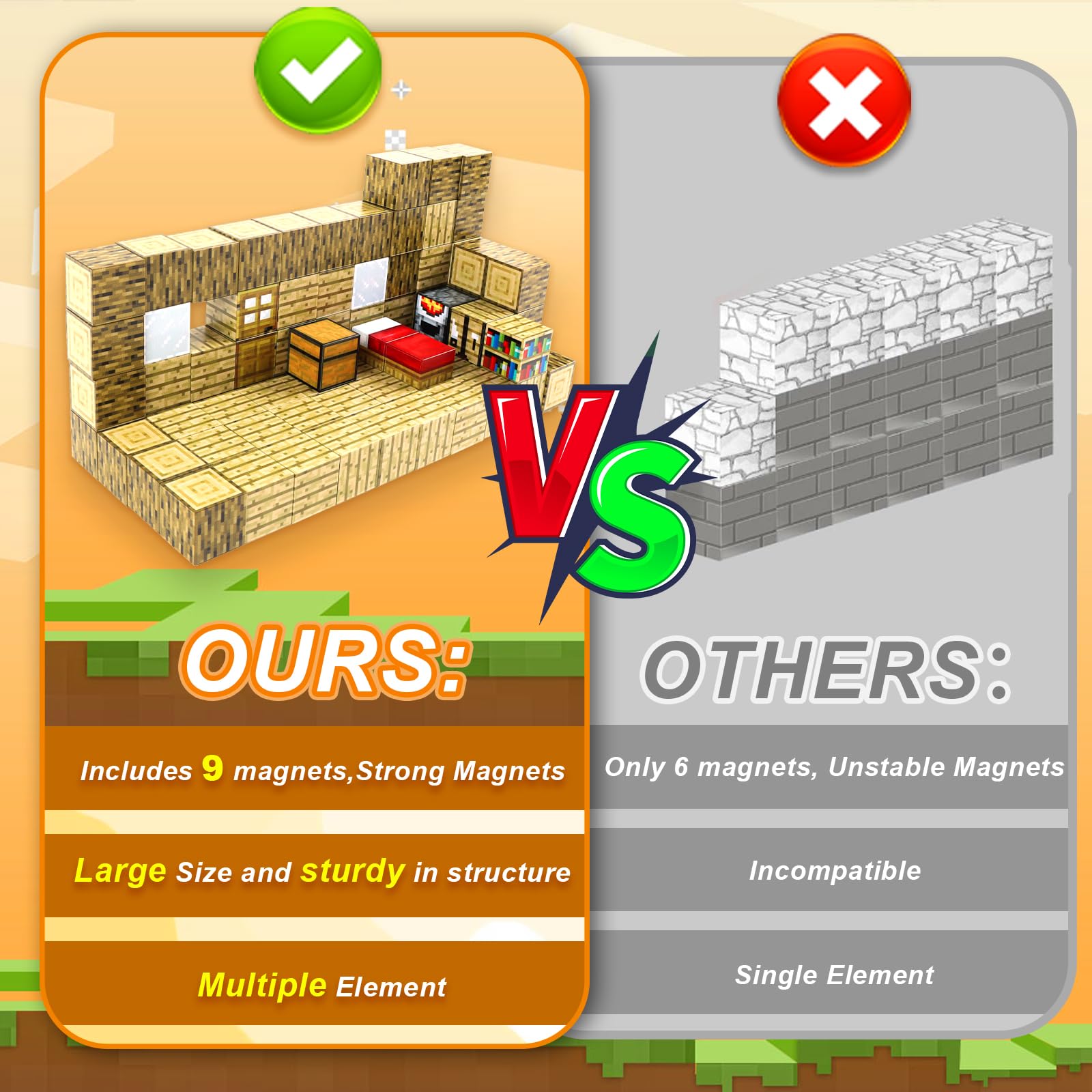 - Unlike other brands that use paper-wrapped designs, sharp edges, or copied content from major creators, our designs are directly printed onto the blocks for durability — and created entirely by us. We also use stronger magnets to ensure structures stay together and last longer. In addition, our blocks are sized to minimize any choking hazards.